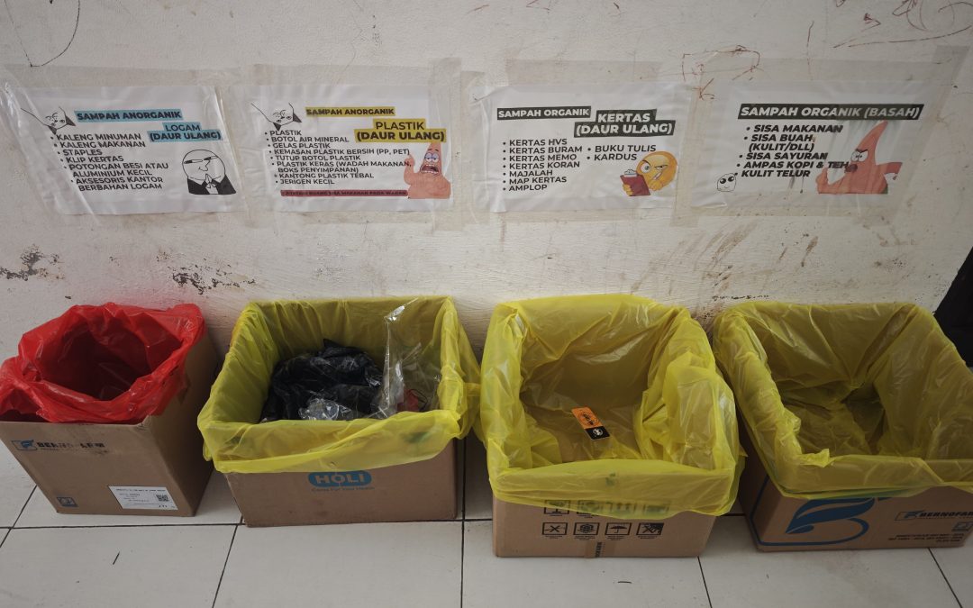 Penerapan pemilahan sampah dilakukan dengan menyediakan beberapa wadah sampah yang telah dipisahkan berdasarkan jenisnya, seperti sampah anorganik (logam dan plastik), sampah kertas, serta sampah organik (basah). Masing-masing wadah dilengkapi dengan label yang jelas guna memudahkan pegawai dalam memilah sampah sesuai kategori sejak dari sumbernya.